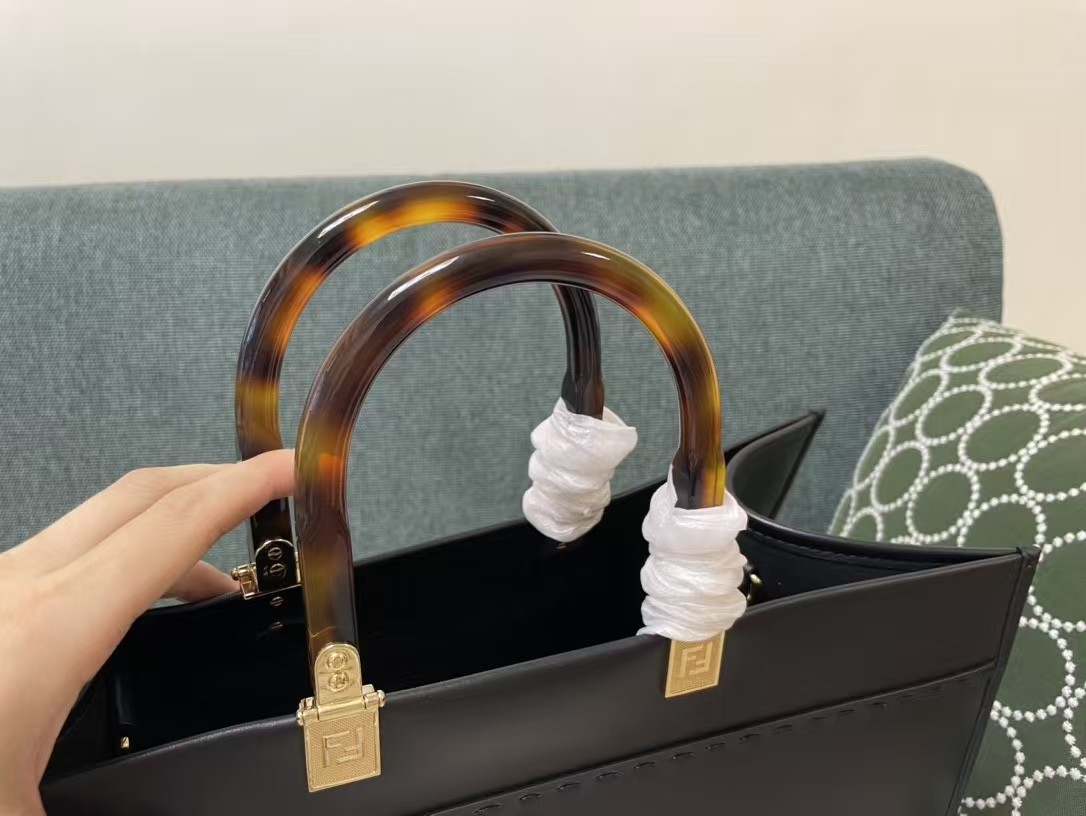 Large Sunshine Shopper bag made from black leather with hot-stamped “FENDI ROMA” and stiff tortoiseshell plexiglass handles.